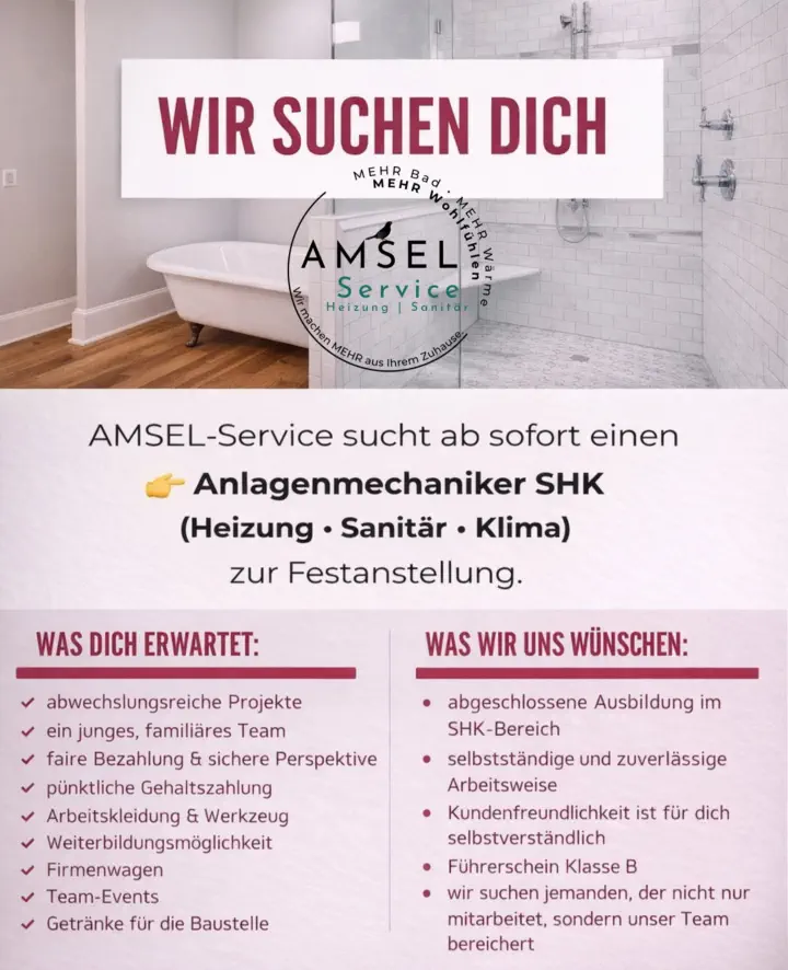 Herzlich Willkommen beim Amsel Service, Ihrer Firma für Heizung und Sanitär!Wir sind Ihr zuverlässiger Partner für moderne Heizungs- und Sanitärlösungen. Ob Neuinstallation, Wartung oder Reparatur – bei uns finden Sie umfassenden Service und maßgeschneiderte Lösungen für ein angenehmes Wohnklima und eine zuverlässige Wasserversorgung.Unser Team aus erfahrenen Fachleuten sorgt dafür, dass Ihre Heizungs- und Sanitäranlagen effizient und umweltfreundlich arbeiten. Mit modernster Technik und höchsten Qualitätsstandards bieten wir Ihnen nachhaltige Lösungen, die sich an Ihre individuellen Bedürfnisse anpassen. Von der Beratung bis zur Umsetzung begleiten wir Sie kompetent und professionell.Entdecken Sie unsere Leistungen und erfahren Sie, wie wir Ihnen helfen können, Ihre Wohnqualität zu verbessern. Kontaktieren Sie uns – wir freuen uns darauf, Ihre Wünsche und Projekte gemeinsam mit Ihnen zu realisieren!Ihr Amsel Service Team